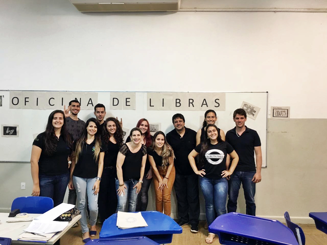 Alunos dos cursos de Agronomia, Licenciatura em Ciências Biológicas e Tecnologia em Análise e Desenvolvimento de Sistemas, que estão cursando a disciplina de Libras com a Professora Jaqueline Zanotti Dalmonech no semestre 2017/2, ministraram uma Oficina de Libras com os temas: Noções iniciais da Língua Brasileira de Sinais com o uso da datilogia; Sinais de cumprimentos dentro da língua Brasileia de Sinais; e Musicalidade em Língua Brasileira de Sinais.