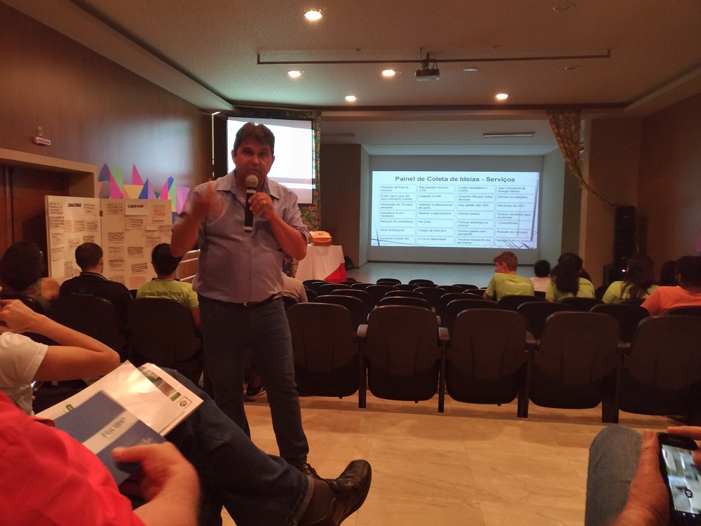 O diretor explica a dinâmica da atividade tempestade de idéias e ressalta que para obter sucesso todos precisariam contribuir.