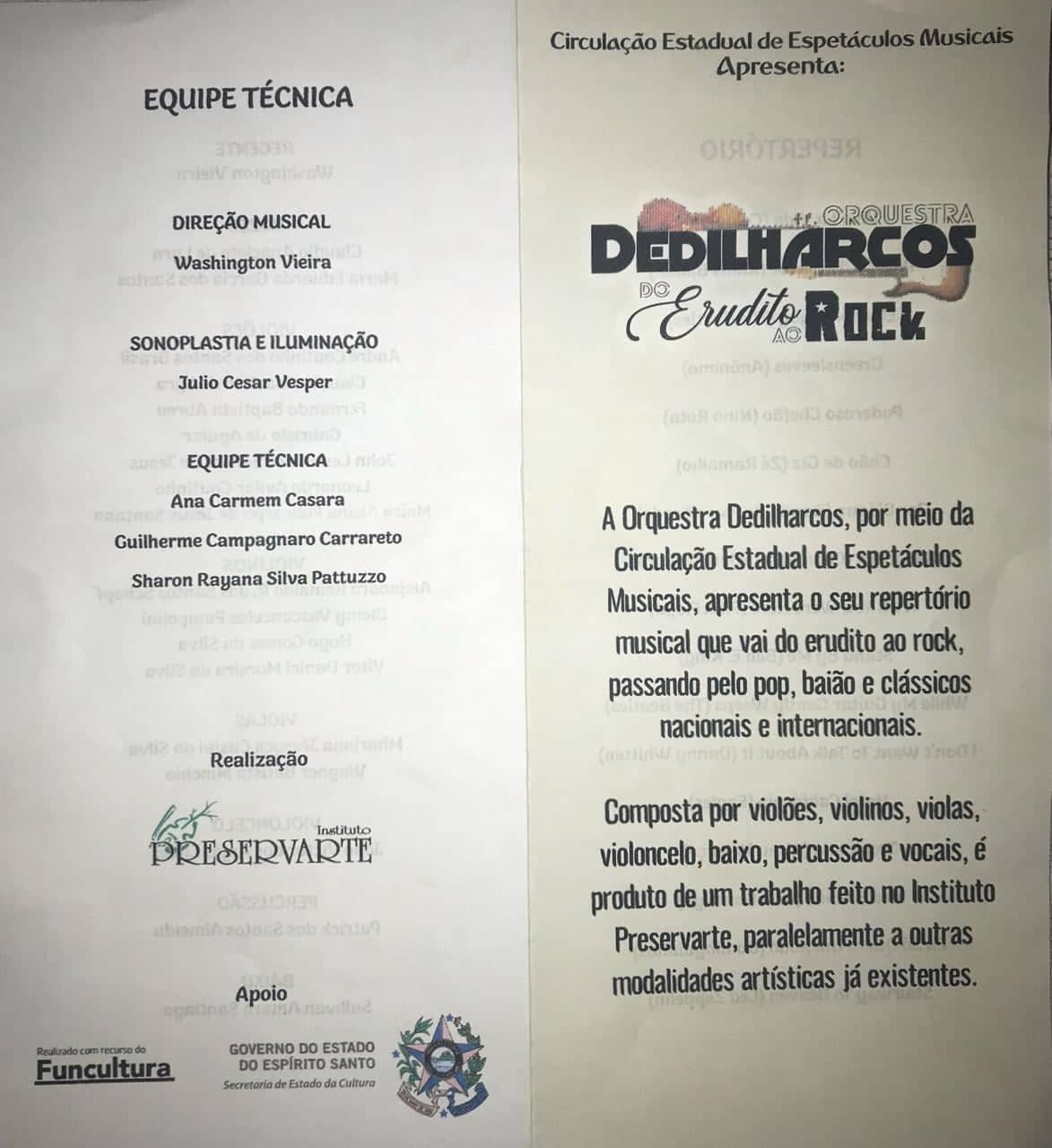 Na quinta, 05, no Auditório II, às 20h, o Campus recebeu a Orquestra Dedilharcos, organizada pelo Instituto Preservarte, que apresenta as nuances de uma orquestra que perpassa entre o erudito, o pop, o rock e outros ritmos, sem perder a originalidade e suas características peculiares. A banda é composta por violões, violinos, violas, violoncelo, baixo, percussão e vocais e conta com Washington Vieira como regente, além de professores e alunos do Instituto Preservarte. Esta apresentação faz parte da Circulação Estadual de Espetáculos Musicais, através da Secult, com recurso do Funcultura.
