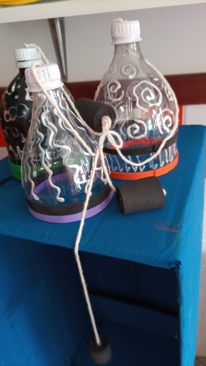 As crianças da Escola Municipal de Educação Infantil (EMEI) “Benjamin Bortolini” receberam bonecos, trenzinhos, jogo do cai-não-cai, jogo do vai e vem, aparatos de super-heróis, bilboquê – confeccionados com garrafas PET, retalhos, tampinhas e papelão doados pela comunidade – bem como jogos da memória – produzidos com materiais descartados por uma marcenaria do Município de Santa Teresa.